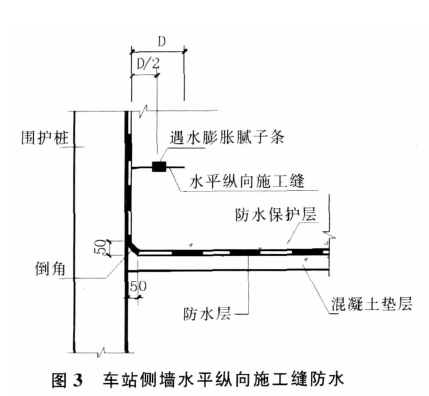 水平纵向施工缝中间设置一道遇水膨胀腻子条,先对接缝处混凝土基面凿毛处理、冲洗干净,并对预留凹槽进行修整、抹平、压实。遇水膨胀腻子条在混凝土浇筑前4 h内安装,以防止提前遇水膨胀;腻子条安装时做到压紧、封闭,不得重叠。水平纵向施工缝与环向施工缝相交部位的防水材料应相互搭接,以形成闭合体系。车站水平纵向施工缝处防水详见图3。