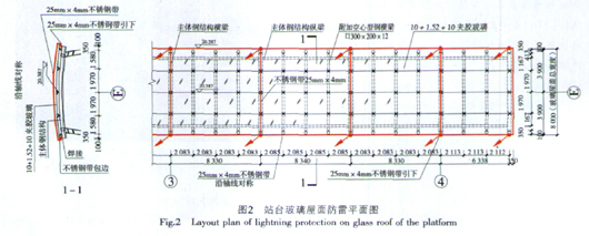 高架车站按建筑二类防雷等级设置防雷措施。广州地铁四号线高架车站主要有两种类型:①车站屋面是金属材料和大面积玻璃的组合;②车站屋面全部采用金属材料。以后广州地铁各条新线的高架车站基本上都会采用这两种类型。图1是其中的一个典型高架车站:黄阁北站。它属于上文中类型①。