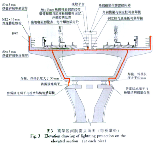 高架区间构筑物按三类防雷设计。当雷击发生时,由于乘客集中在车辆法拉第笼的保护范围内部,没有雷击危险,所以高架区间的防雷,主要是保护高架区间、区间设备和区间维修人员的安全。