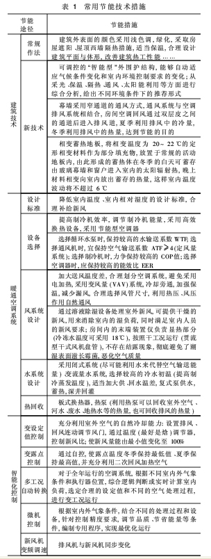采暖空调系统要节能,除提高系统运行效率和设备合理匹配外,还需要其他相关专业的有效配合,常用的节能措施如表1所示。