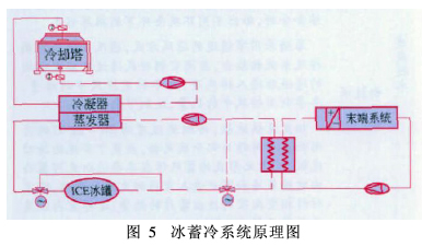 冰蓄冷是利用冰的相变潜热进行冷量储存的一种供冷系统(见图5)。它利用夜间的低谷用电进行蓄冰制冷,将能源以冰的形式储存;在白天高峰用电期间,则通过融冰释放的冷量供给空调系统使用。