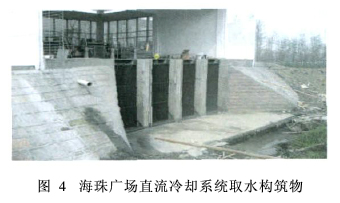 在采用此方案时,前期需做大量的基础工作,从水文、水温及水质资料的收集,到请专业单位进行环境影响评价、航道水利报批,各个环节都需要落实确定。另外,完成取水工艺的初投资也比较大。图4为广州地铁2号线海珠广场直流冷却系统取水构筑物。