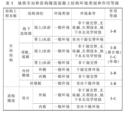 参照CCES01—2004《混凝土结构耐久性设计与施工指南》、JTG/T B07-01—2006《公路工程混凝土结构防腐蚀技术规范》、《铁路混凝土结构耐久性设计暂行规定》和《混凝土结构耐久性设计规范》讨论稿的相关规定,地铁车站和盾构隧道混凝土结构按照环境类别及作用具体划分见表1。