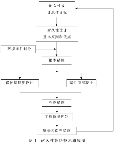 针对地铁结构混凝土所处的特殊环境荷载情况,耐久性设计的基本路线是将根本措施和补充措施相结合;对工程在设计、实施、使用管理、维修保养等全过程中,按技术路线(见图1)进行综合协调处理。