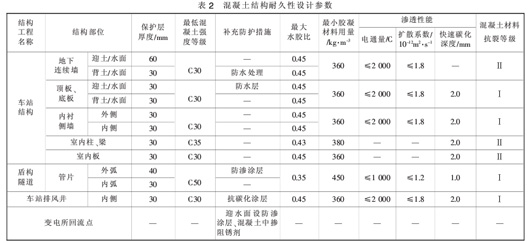 高性能混凝土是轨道交通混凝土结构耐久性设计的根本措施。主要控制指标见表2。