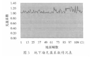 根据实测数据及地下墙统计资料来看,地墙充盈系数平均为1.05(图3),垂直度平均为1/800,满足相关规范及技术要求的规定。周围同类地质条件下建筑的地墙施工,其充盈系数一般为1.25左右,本工程采用深井降水措施后极大的降低了充盈系数的值,也提升了地墙施工的质量,同时取得了良好的经济效益。