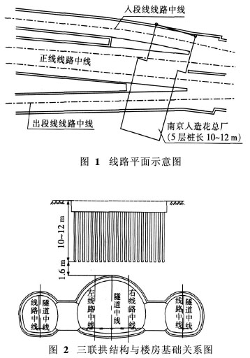 南京市轨道交通1号线南延安德门—宁丹路区间,在左、右行车线两侧引出车辆段出入端线形成了双线、双联拱、三联拱大跨度不等跨联拱隧道。隧道主要穿越泥质粉砂岩,岩土软弱、岩体的自稳能力差,易产生不均匀变形。其中三联拱区段上方有5层的人造花总厂办公楼,楼房桩基长度10~12 m,隧道拱顶距桩底垂直距离为1. 6 m。如图1、图2所示。