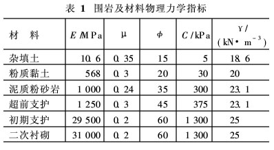 根据隧道临近地质勘探XR15钻孔地质分层、各层地层勘探统计物性指标,计算所采用的地层和结构物理力学参数具体如表1所示。楼房附加荷载根据最不利情况,框架结构的办公楼按每层16 kPa考虑,均布于楼房基础上方。