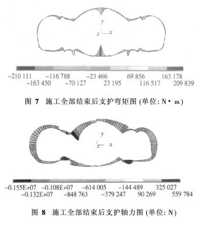 根据计算结果,从支护结构受力角度出发,总体上中洞法优于侧洞法,其中,中洞法各种方案结构内力相差不多。