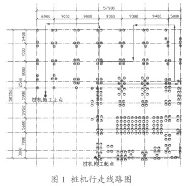 按以往经验,静压桩挤土效应在桩机行走方向上的影响最大,考虑本工程在南边及西南边的建筑物较多,因此选择桩位起点在工程的西南边,由西向东进行施工,如图1所示。