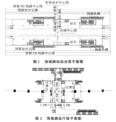 港城路为路边站,并预留有换乘M1线设计条件。地铁M1线目前尚在规划研究阶段,考虑将地铁6号线与M1线同层并肩高架设置。M1线规划与6号线平行布置,M1线实施后站台形式由侧式站台演变为两个岛式站台。远期可以考虑在站台布置自动售票机,乘客可在站台购票直接换乘,而不必下至站厅层,提高车站旅客通行效率。M1线自动扶梯下至站厅东侧,未来扩建可形成6号线与M1线的共用站厅(见图1)。
