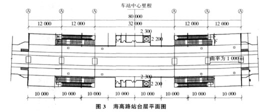 海高路站为上海轨道交通6号线唯一的曲线站,轨道上行线曲率为1 000 m,如何解决曲线线路与车站平面相结合为主要设计难点。常规状态下,站台的几何参数要与轨道的相符。该站靠线路站台边线为与线路平行的曲线,满足车辆通行的需要,并最大限度地减小了车辆与站台之间的水平距离。为便于施工并使建筑形体简化,站台外侧建筑轮廓为分段折线,同时满足站台最小宽度的要求。站厅宽度由通向站台的楼扶梯限定宽度并进行定位。海高路设计通过对曲线线路的几何形态分析,在现有技术施工条件下实现线路与站台、站厅平面的最佳结合(见图2,图3)。