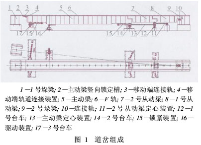 道岔的主要结构体是道岔钢梁,为箱形结构,共有3段。钢梁与钢梁之间分别由十字销连接,每段钢梁两端均有台车支撑,驱动装置位于道岔主动钢梁的下方。当驱动装置推动梁体横向移动时,梁下的台车沿着轨道移动,实现转线,道岔(单开)的组成详见图1。