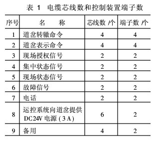 中低速磁浮交通运行控制系统向道岔送出转辙命令信号、现场授权信号、DC24电源(3A)和信号专用线路;道岔向运行控制系统送出位置表示、集中状态、现场状态、故障4类信号。运行控制系统使用的电缆芯线数量和道岔控制装置使用的端子数量详见表1。