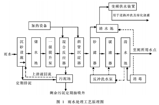 雨水作为一种自然资源,污染少,处理容易,经简易的处理即能作为生活用水,其处理工艺原理见图1。