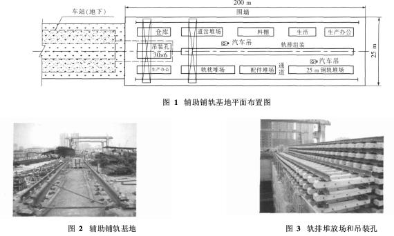 一般地,铺轨基地设置于车辆段和停车场,利用其便利的场地条件集中进行轨料储备、堆放,组装轨排、焊接长轨条等需要较大面积的作业,而辅助铺轨基地的设置则更加灵活。若工程含有高架区间,辅助铺轨基地应尽量设置在高架区间部分。若全部为地下线,辅助铺轨基地一般选择在明挖车站或埋深较浅的明挖区间,位置可选择在本线的中部,也可选择在工程起点或终点。辅助铺轨基地所处位置应场地平整,具备设置吊装孔和龙门吊条件,周边道路能通行运输物资车辆,具备连接市政电网和水网条件。辅助铺轨基地长度一般不小于200 m,困难时不小于150 m;宽度一般不小于25m,困难时不小于20m。辅助铺轨基地应尽量布置为规则的长方形。受场地和其他条件的制约,辅助铺轨基地一般包含以下几部分:生产办公区、25m钢轨堆放场、轨枕堆放场、配件堆放场、钢筋堆放及加工区、轨排组装区、材料棚、龙门吊和生活区等。