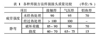 根据实验资料,焊接长钢轨的各种焊法,其焊接接头的质量,以母材为100%作比较,结果如表1所示。