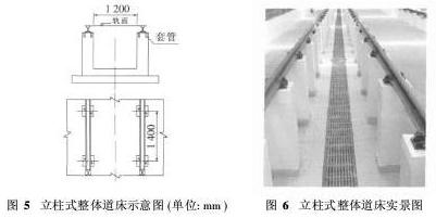 某市地铁1号线车辆段库内立柱式整体道床施工时,采用预埋套管的方式,结果施工精度无法满足轨道安装的要求,造成凿除立柱上部结构,重新施工,影响了工程工期,带来了经济损失和不良的社会影响。上海地铁11号线赛车场车辆段库内立柱式整体道床采用架轨法施工,施工精度高、进度快、质量好,获得了业内专家和业主的好评。
