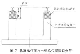 在架轨施工之前,需要与土建承包商做好沟通协调工作,即将轨面以下500 mm(视情况可调整)部分的混凝土浇筑移交给轨道承包商,土建承包商负责立柱钢筋的制安及-0. 5 m(轨面标高视为0)以下部分的混凝土浇筑。工程分界如图7所示。