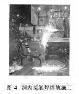 接触焊的基本原理是利用电流通过某一电阻时所产生的热量熔接焊件,再经顶锻以达焊接目的。接触焊法,焊接质量好,效率高,世界各国普遍采用,也是我国地铁工程采用最多的焊接方式。图4为洞内接触焊焊轨作业现场。