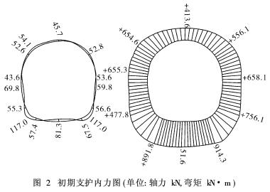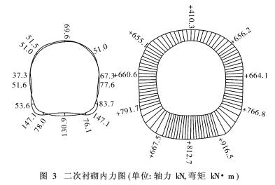 采用荷载-结构模型平面杆系有限单元法。选取地质条件最差、最不利典型横断面进行承载能力极限状态和正常使用极限状态的计算。计算简图和计算结果见图1~图3。
