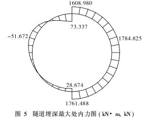 计算模型采用修正惯用设计法。考虑管片接头影响,进行刚度折减后按均质圆环进行计算,水平地层抗力按三角形抗力考虑,计算结果考虑管片环间错缝拼装的影响进行内力调整。计算简图和计算结果见图4~图6。