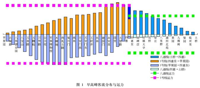 ah越大,表明双方向客流越不均衡,当ah≥1. 5时,其不均衡程度较大。八通线的αh=1. 75,表明此线路在早高峰的客流分布不均衡程度高,客流向城市中心流动量大,如图1所示。当客流分布不均衡时,早高峰进城方向大客流对换乘站单方向换乘压力加大,导致四惠和四惠东两个站内的换乘客流积压,不仅影响后续列车进站、降低全线行车效率,而且无法缩短运行间隔和提高运输效能。