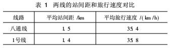 八通线的平均运距相比其他运营线路(除8号线和机场线外)占线路长度百分比最长,即平均乘客大约乘坐本线总长度的2/3路程,基本属于通勤客流。但是,按照担负通勤任务的市郊线路要求,八通线站间距和旅行速度的优势并不明显,如表1所示。