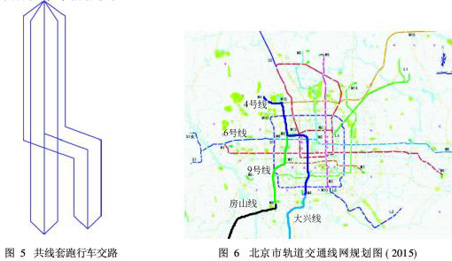 在北京西部南北方向贯通运营的线路至少要等到远期规划的16号线开通后,而初、近期却缺少市域快线在这一区域发挥作用。2005年北京交通出行调查的数据显示,郊区客流出行的主要目的地是旧城、中关村和CBD地区。从需求上讲,应考虑临近中关村区域的9号线与其他线的联通运营。假如像图5所示的行车交路,这种人字形的结构类似于房山线和9号线与大兴线和4号线共同组成的线网布局。如果采取此交路行车,正线列车分别交替并线贯通运营,对解决中关村地区的大客流量以及增加西部线网直通覆盖面积将有很大的促进作用。但是,当两个非共线部分的线路上客流量很大时,则不适宜采取此共线交路的运行方式。从另外的角度讲,房山线与9号线直通运行的考虑,正如大兴线与4号线的直通运行一样,可在初期和近期避免换乘上的压力、降低换乘率,并对优化北京轨道交通线网起到一定的积极作用。