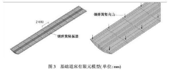 为探讨此类钢弹簧浮置板式轨道基础道床在列车荷载作用下的受力特点,优化结构设计,本文采用有限元软件建模对其进行模拟分析。
