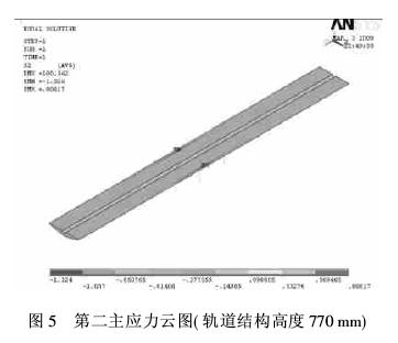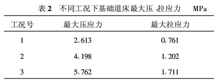 2)列车荷载作用下,随着轨道结构高度的降低,基础道床压应力和拉应力相应增大,但三种工况下出现的最大拉、压应力均小于C40混凝土的强度值。此外,从实际工程情况分析可知,降低轨道结构高度具有施工可能性。从而,轨道结构高度从840 mm变为770mm,亦即基础道床厚度从325 mm变为255 mm,能满足结构强度和功能的要求。建议轨道结构高度可取770mm;