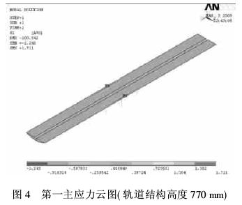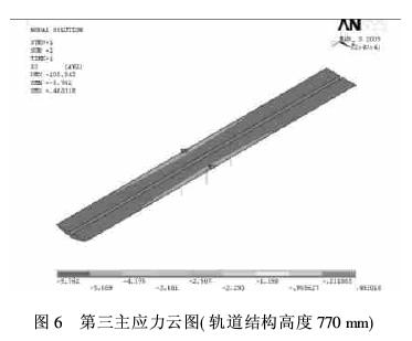 根据拟定的三种工况,分别计算其轨道基础道床应力。这里取最不利的工况3应力云图,如图4、图5、图6所示,反映了应力的具体分布情况。
