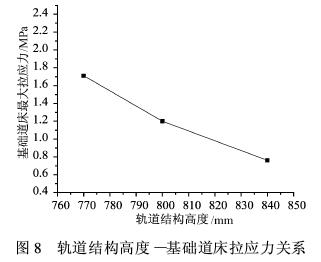 从表2、图7和图8可以看出,随着轨道结构高度的降低,基础道床的拉、压应力均在增大,拉应力的增幅较之压应力小。