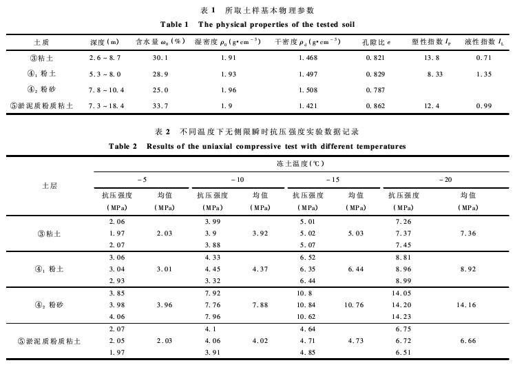 (4)常规设计温度-10℃下,原状③粘土、④1粉土、④2粉砂、⑤淤泥质粉质粘土无侧限抗压强度分别为3.92 MPa、4.37 MPa、7.88 MPa、4.02MPa。