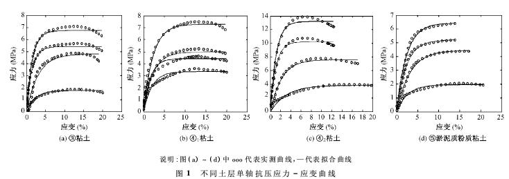 图1分别为原状③粘土、④1粉土、④2粉砂和⑤淤泥质粉质粘土在温度为-5、-10、-15、-20℃下冻土单轴抗压应力-应变变化曲线,除了找出各土层应力应变发展规律,还对其应力应变曲线进行了模型曲线拟合。
