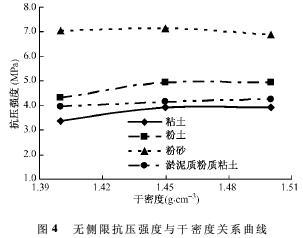度的关系曲线,如图4所示,由图可见,4种土层抗压强度随土体干密度增加几乎不变,所以干密度对冻土