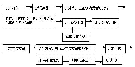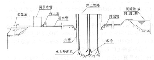 水力排土沉井下沉工艺系使用高压水(水泵出口压力宜大于1.2MPa)通过水枪将土体破碎并与水枪的出水混和成一定浓度的泥浆,然后由水力吸泥机或泥浆泵经由输泥管路吸排出沉井井送至泥浆沉淀池或直接排放至河道、湖、海等水体中。