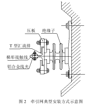 牵引网的主要技术参数:(1)支持点间距取值范围一般为 2.5~3.0 m。(2)拉出值主要由集电器滑板工作宽度、限界及绝缘距离要求来决定,一般为±60 mm。在膨胀接头处,2 根汇流排平行排列,实现集电器平稳过渡。(3)锚段长度一般为100~150 m,并在其中间部位设置中心锚结。在锚段终端两侧汇流排平行重叠排列,重叠长度一般为5 m(25 ℃),重叠区接触导线间距为 70 mm,构成锚段关节。(4)牵引网载流、受流系统由 T 型汇流排+线夹+梯形硬铜 150 mm2 接触线组成,其典型安装方式见图 2。