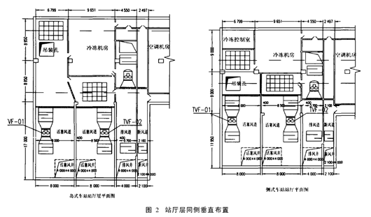 该布置方式的典型平面图如图4,风井直接开在车站顶部,TVF风机布置在车站站厅,顺线路方向布置。在路网规划时,可结合道路规划,预留地铁风井设置条件,将风井设在城市道路中间的绿化带内。对于屏蔽门系统模式,在大系统采用每端1台空调机组加1台回排风机的设置时,可以将TVF风机房、TEF风机房和空调机房结合布置,做到环控机房面积最优布置。
