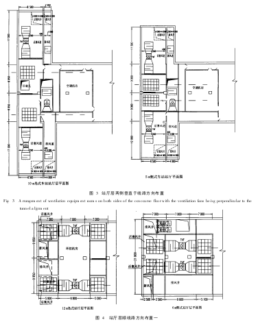 为了满足隧道通风要求和便于运营管理,隧道通风机房一般都布置在车站的两端,较长的区间隧道(长度>1.5km),有可能需要在区间中部设置中间风机房。隧道通风机房(包括风道)占用面积较大,其布置的好坏往往直接影响车站的建筑方案。以下结合不同车站形式,不同的环境条件介绍隧道通风机房的布置方式。
