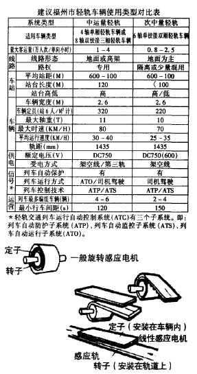 根据《福州市城区公共交通规划—调查分析报告集》预测,福州市未来的客流量属于次中量至中运量范围,因此从轨道交通车辆的基本特性、适用范围、技术水平和经济条件等具体情况进行分析筛选,适合福州市经济而实用的方案有两个可供决策时参考(如右上表)。