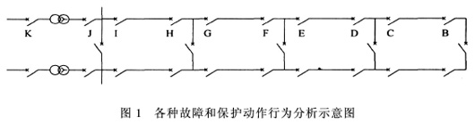 要考虑在任意处发生短路,再在任意处发生下列各种异常情况:光纤故障、断路器失灵、保护退出、相互闭锁连线断开、母线故障,保护不会越级跳闸等。现以图1举例予以分析。具体分析见表1。其中B处是末端站。