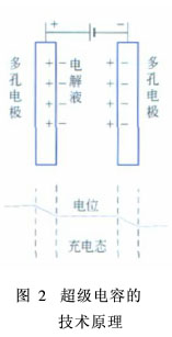 在双电层电容器中,采用活性炭材料制成多孔电极,同时在相对的碳多孔电极之间充填电解质溶液。当在两端施加电压时,相对的多孔电极上分别聚集正负电子,而由于电场作用,电解质溶液中的正负离子将分别聚集到与正负极板相对的界面上,从而形成两个集电层,相当于两个电容器串联,如图2所示。