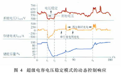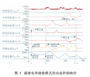 图4是2002年在西班牙首都马德里地铁做的一次测试。可以看出:在t1时刻,由于多列车同时加速,导致系统电压下降至规定的最小值,此时超绝电容开始放电(ISES为负),一直到t2时刻,以保证系统电压稳定在510 V的水平;当多列车同时加速的状态结束时,系统电压回升,超级电容处于充电状态(通过变电站或列车制动产生再生能量来充电);t3、t4时刻表明,列车制动时充电电流快速上升,超级电容的能量迅速存储起来。