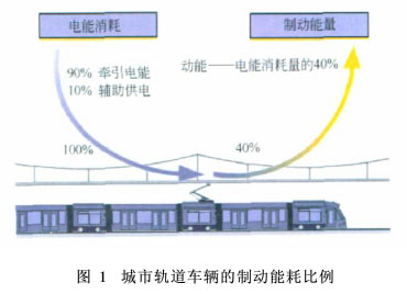 随着城市人口的膨胀,城市轨道交通显得越来越重要。我们在建设城市轨道交通时,必须考虑经济与环境的和谐发展。从经济角度看,城市轨道交通系统的能耗最引人关注,能耗费用占了运营费用的相当大的部分。怎样有效利用能源、减少能耗,是摆在我们面前的一个重要课题。调查显示,在城市轨道车辆的能耗中,牵引能耗占了90%,车辆辅助设备能耗占10%。如果采取适当的措施,如合理安排车辆运行、使用超级电容等能量管理设备,电能消耗量的40%就可以在车辆制动时反馈回供电系统,以供给正在加速的车辆使用,如图1所示。