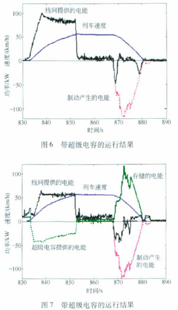 如果没有能量储存系统(如超级电容),当有很多车辆在同一时间内加速时,则系统电压会降到一个非常严重的水平,导致车辆频繁地低电压波动,从而在一段时间内影响乘客服务质量。对于这个问题,可以采用超级电容来得到解决。如果系统电压降到规定的限制值,超级电容将会放电,以提高系统电压。