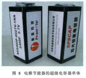 在城市轨道交通领域,国内仍处于研究阶段,还没有成熟产品。目前,国内研究生产的超级电容器主要用在电动汽车、电力系统等领域。其容量和功率相对较小,例如用在电梯节能器上的超级电容器(见图8),其容量为0.5 kW·h,功率也只有几十kW。
