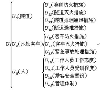 模型中,决定总目标的因素集U由两个层次的因素所构成,第一层次因素为U={US(隧道),Uk(地铁客车),UH(人)}。第二层次因素分别为US={U1S(隧道防火措施),U2S(隧道灭火措施),U3S(隧道排烟通风措施),U4S(隧道避难措施)},UK={U1K(客车防火措施),U2K(客车灭火措施),U3K(紧急事故处理措施)},UH={U1H(工作人员工作态度),U2H(工作人员受训程度),U3H(乘客安全意识),U4H(管理体制)}。
