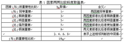 假设bij表示bi相对于bj的重要性数值,bij按表1取值,根据表1构造判断矩阵