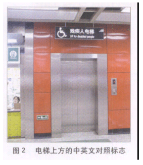 广州地铁的向导标志中每一标准文字都以中英文2种文字出现。中英文比例得当,中文在上方,英文在下方。 同时向每一个乘客传达同样的资讯,以免产生歧义。除了车站的站名外,中英文对照一般不注音标。(图2)